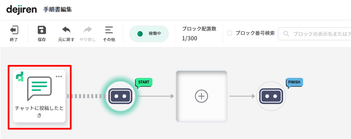 VAが動くきっかけを「チャットに投稿したとき」「dejiren」に設定後、 「チャットに投稿したとき」ブロックをクリックします。