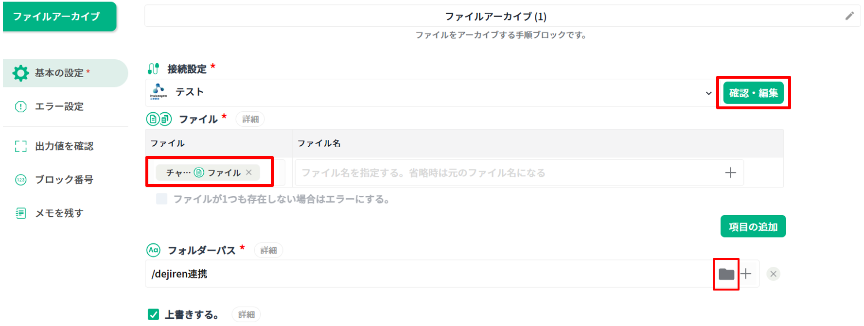 「高度な手順ブロック一覧」から「ファイルアーカイブ」ブロックを配置します。