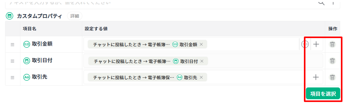 「カスタムプロパティ」は[項目を選択]ボタンより 「取引先」「取引日付」「取引金額」を選択します。