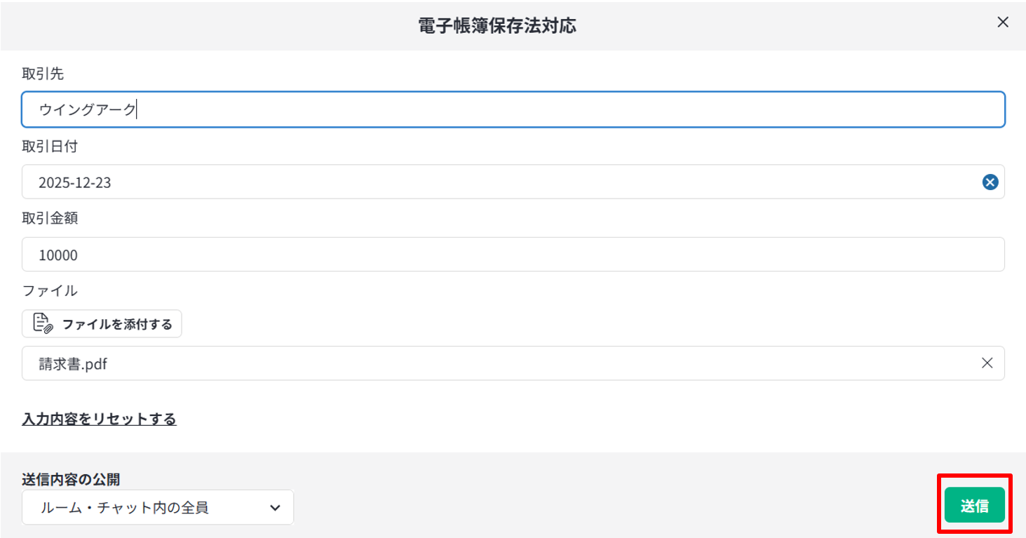 「ファイル」欄の[+]をクリックして、 「チャットに投稿したとき → 受信したファイル → 電子帳簿保存法対応 → ファイル」を選択します。