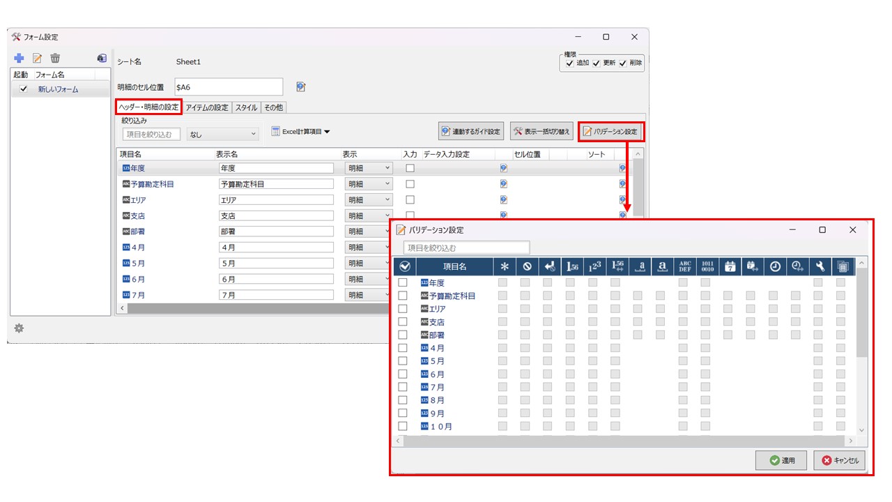 [ヘッダー・明細の設定]タブの[バリデーション設定]をクリックします。