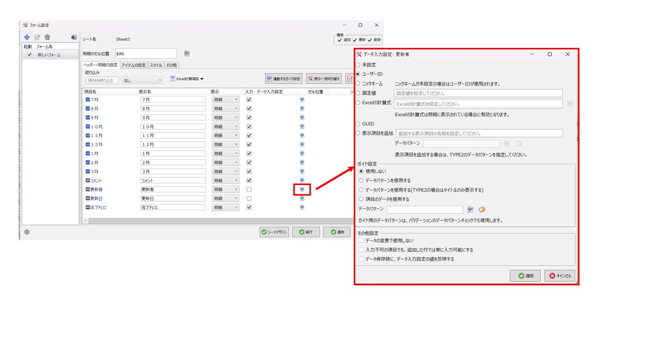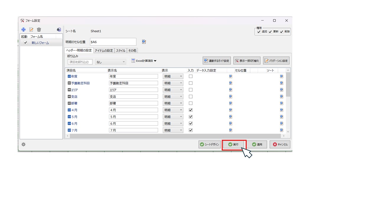 フォーム機能とは、データソース上のテーブルの項目をExcelシート上で帳票イメージ(フォーム)として開き、フォーム上で値を更新することで、データソース上のテーブルの値を更新する機能です。フォームには、データを更新するための項目や、データ更新を補助するためのボタンアイテムなどを配置します。