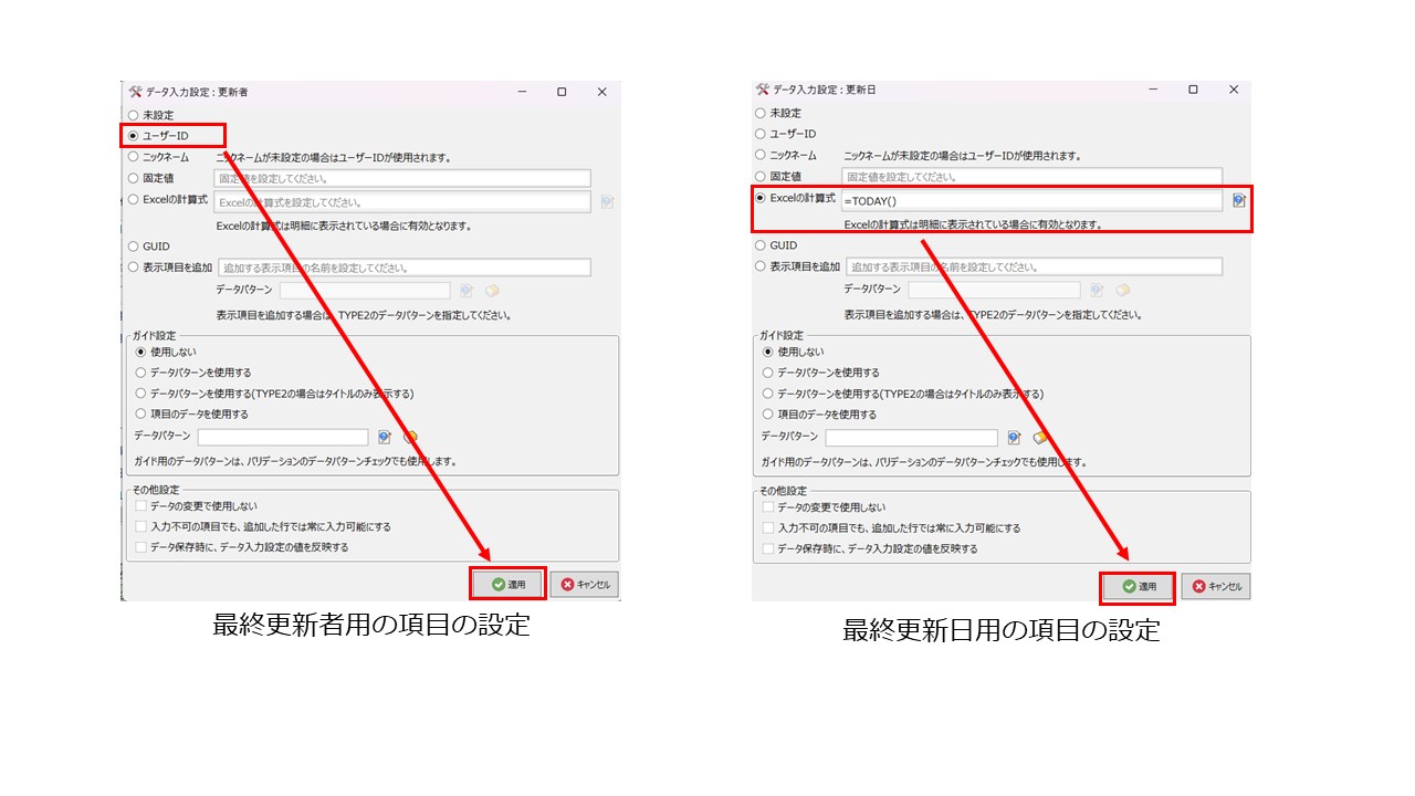 ・最終更新日→「Excelの計算式」を選択し、「=TODAY()」と入力します。