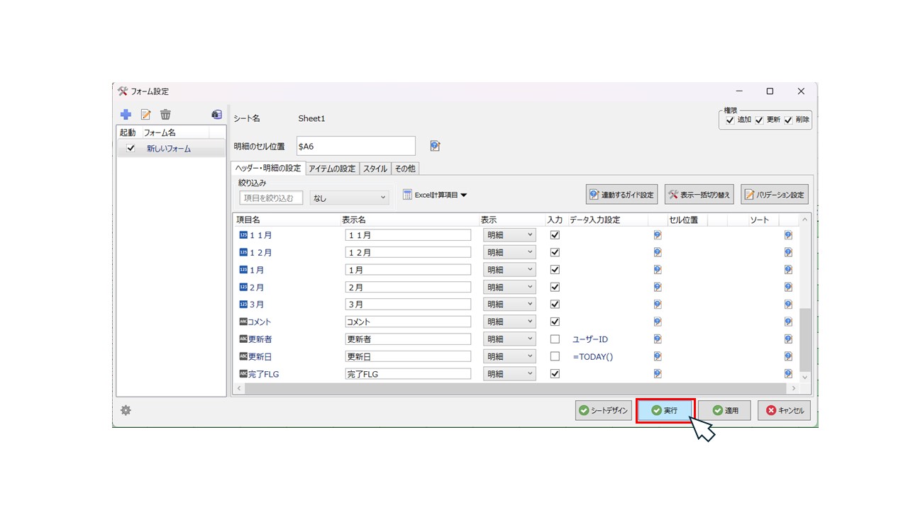 シート上にフォームが展開されました。これでデータ更新が可能となります。