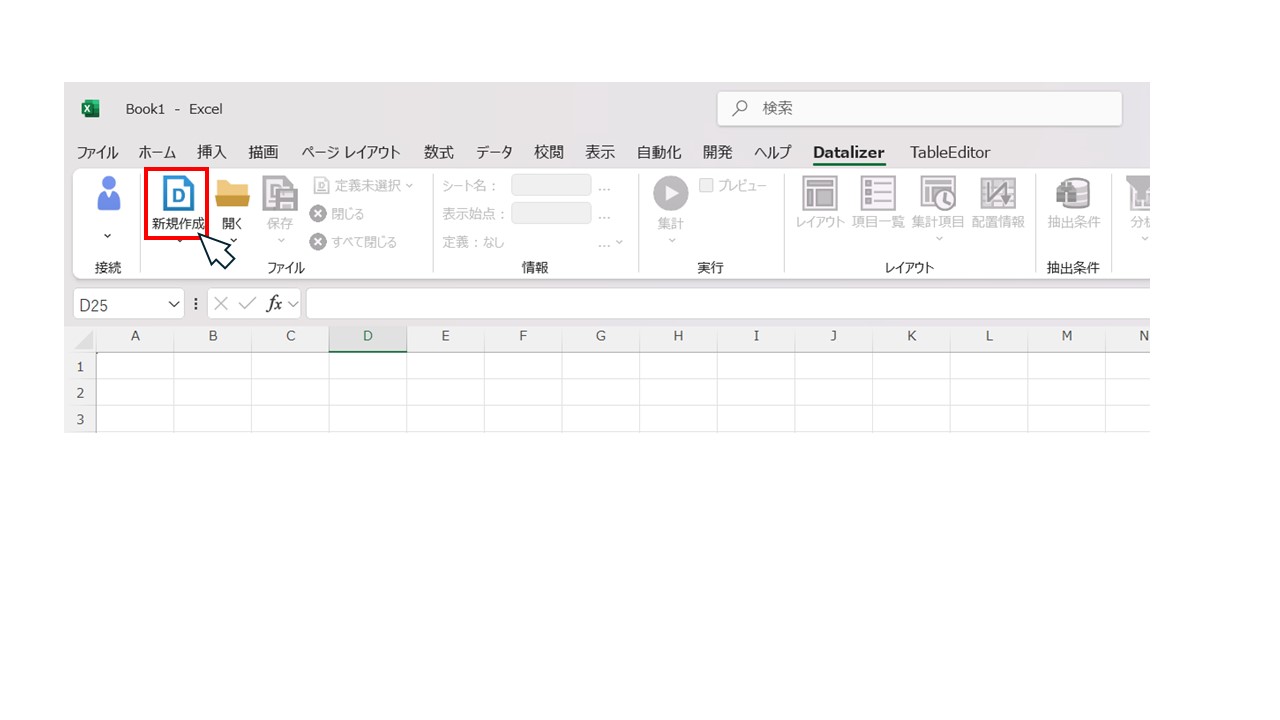 Excelを起動し、[Datalizer]タブを開き、[新規作成]をクリックします。