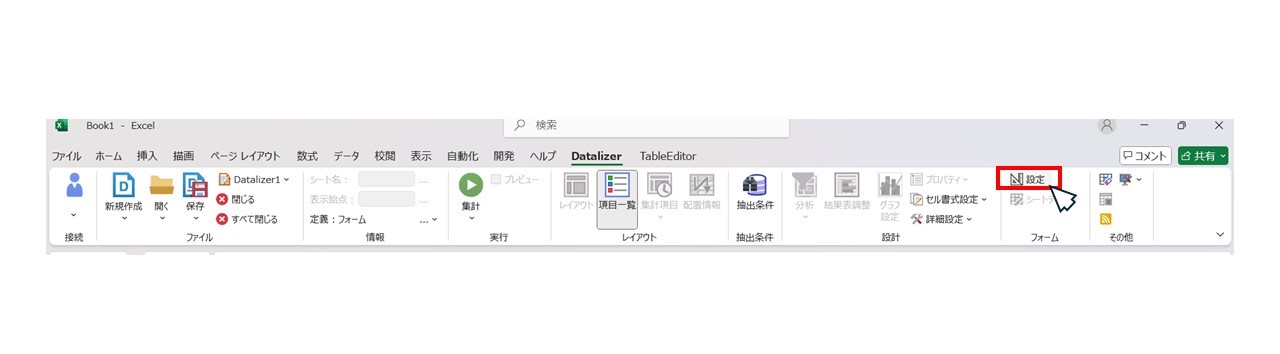 メニューの[Datalizer]タブの「フォーム」リボンにある[設定]をクリックします。