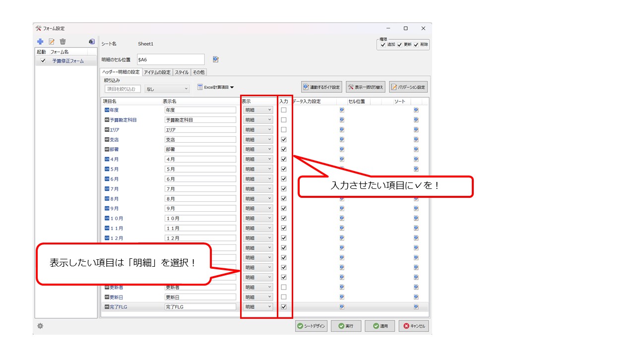 入力させたい項目は[入力]の欄のチェックボックスにチェックを入れます。