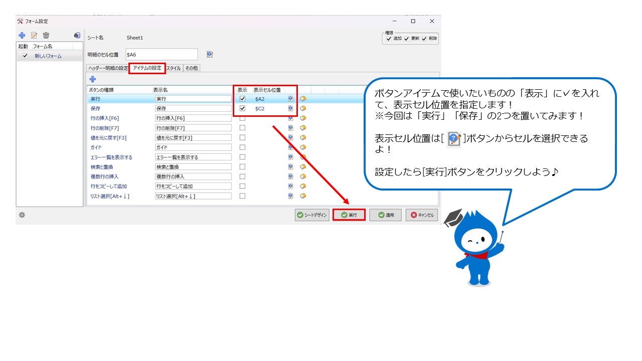 今回は[実行]と[保存]ボタンを配置し、[実行]ボタンをクリックします。