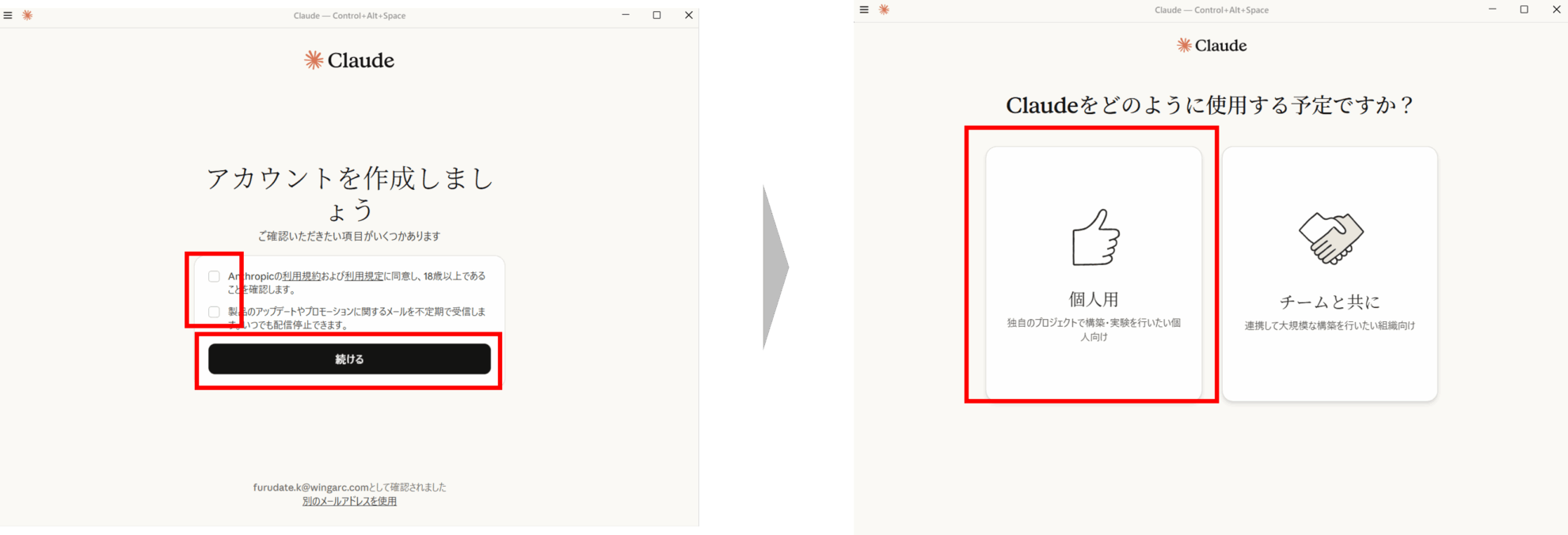 アカウント作成画面が表示されたら、利用許諾2項目にチェックを入れ、[続ける]をクリックします。