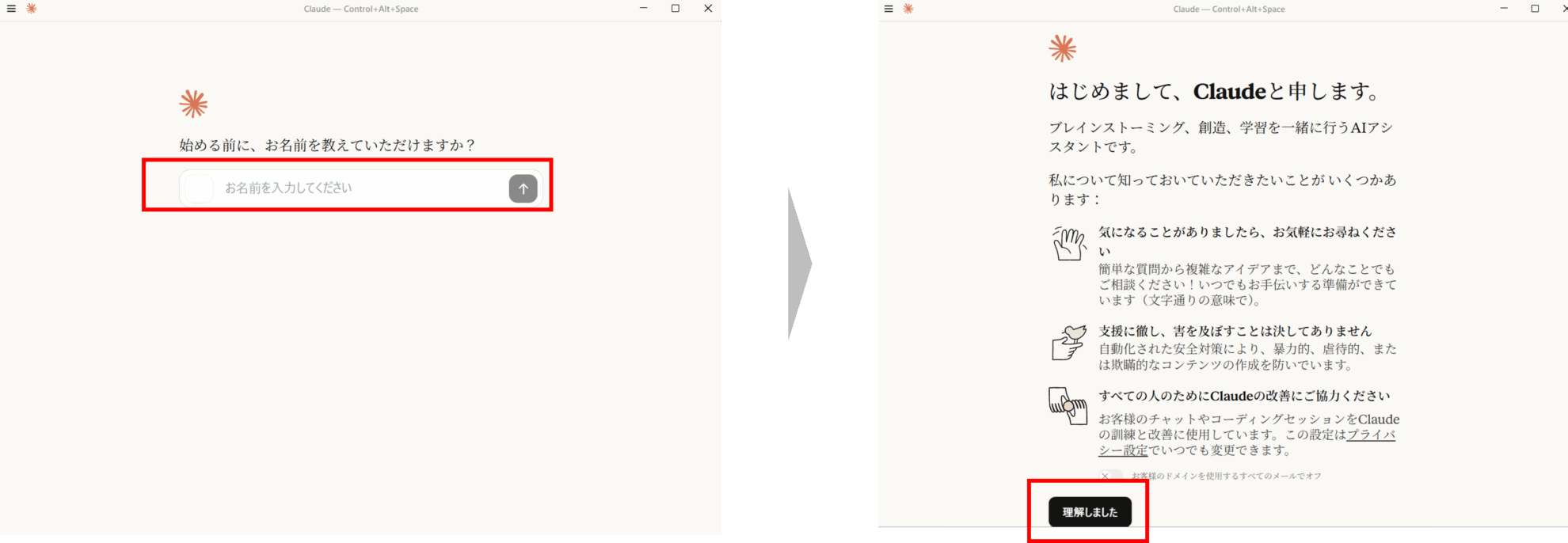 名前を入力後、確認画面で[理解しました]をクリックします。