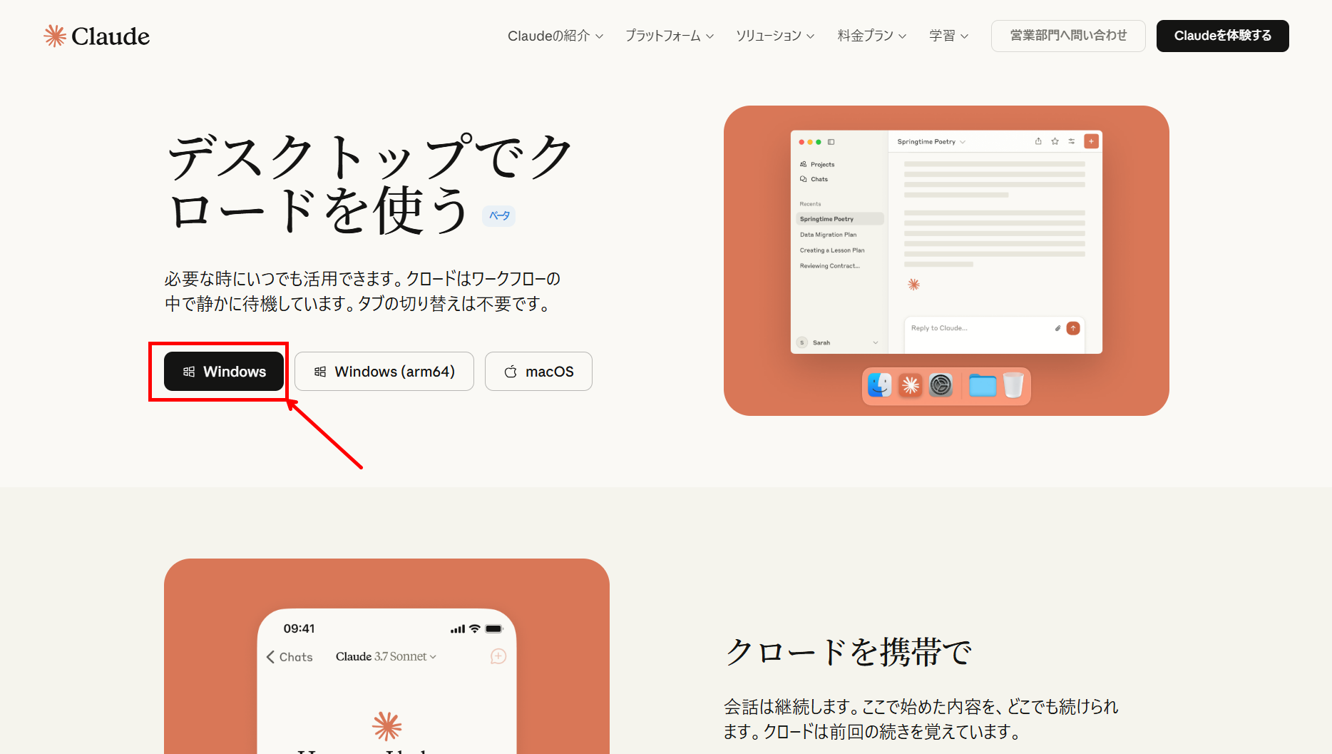 MCPホストとしてClaudeを使用します。以下のサイトからClaude Desktopのインストーラーをダウンロードします。