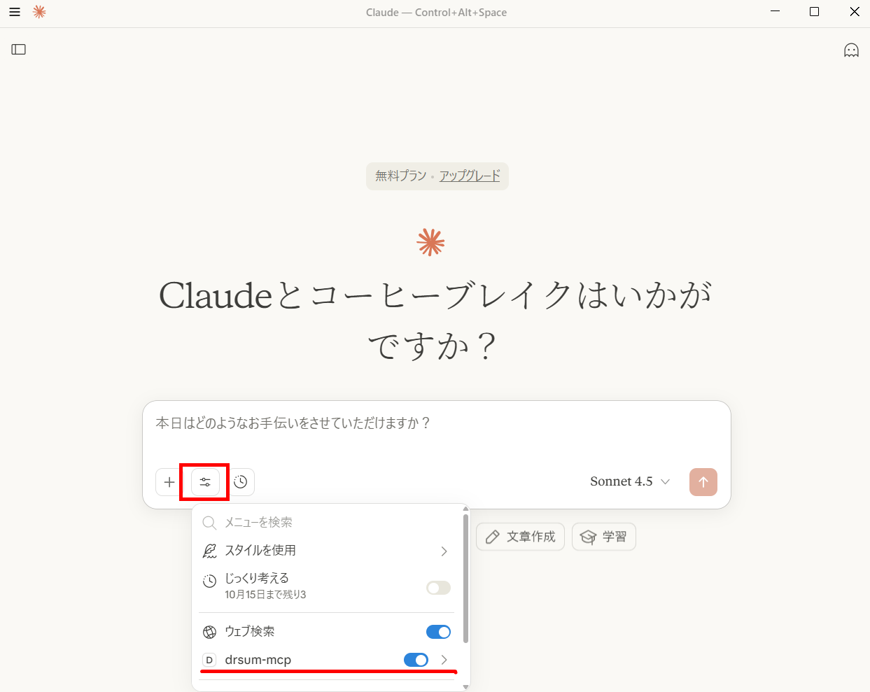 新規チャット画面で設定アイコンをクリックし、“drsum-mcp”が有効化されていれば、MCP設定は完了です。