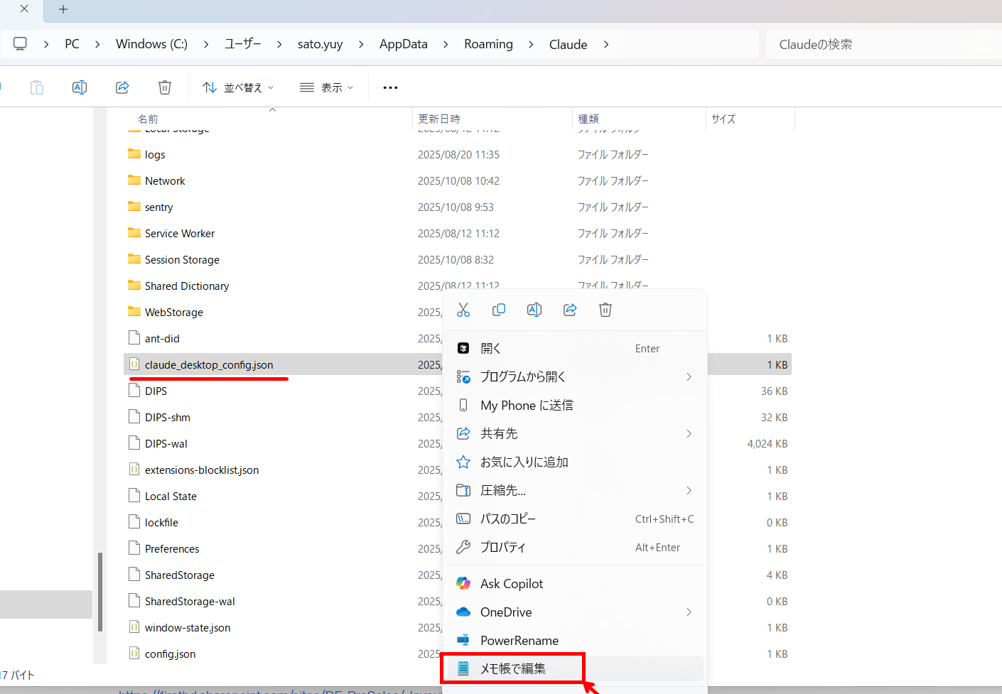 Windowsエクスプローラーで “C:\Users\[ユーザー名]\AppData\Roaming\Claude\” フォルダ内の"claude_desktop_config.json"