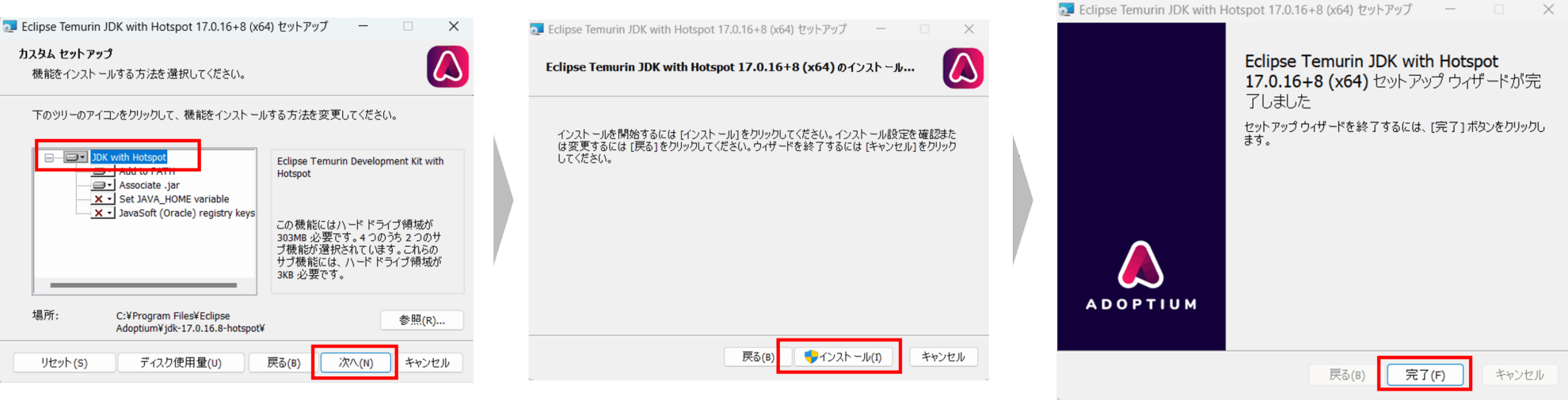 カスタムセットアップで[JDK with Hotspot]を選択し、[次へ] → [インストール]をクリックします。