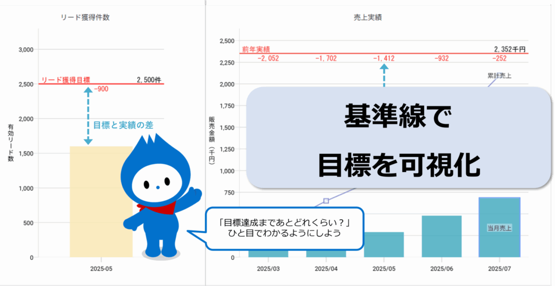MotionBoardではグラフやチャートを使用して、営業実績の可視化やマーケティングにおけるリードの獲得数の見える化が行えます。このような実績値を可視化する際に目標値を表す「基準線」を使用して、目標と実績の差を視覚的に捉える方法をご紹介します。