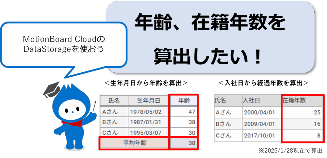 「生年月日から本日時点での年齢を算出したい」「入社日から本日時点での在籍年数を算出したい」