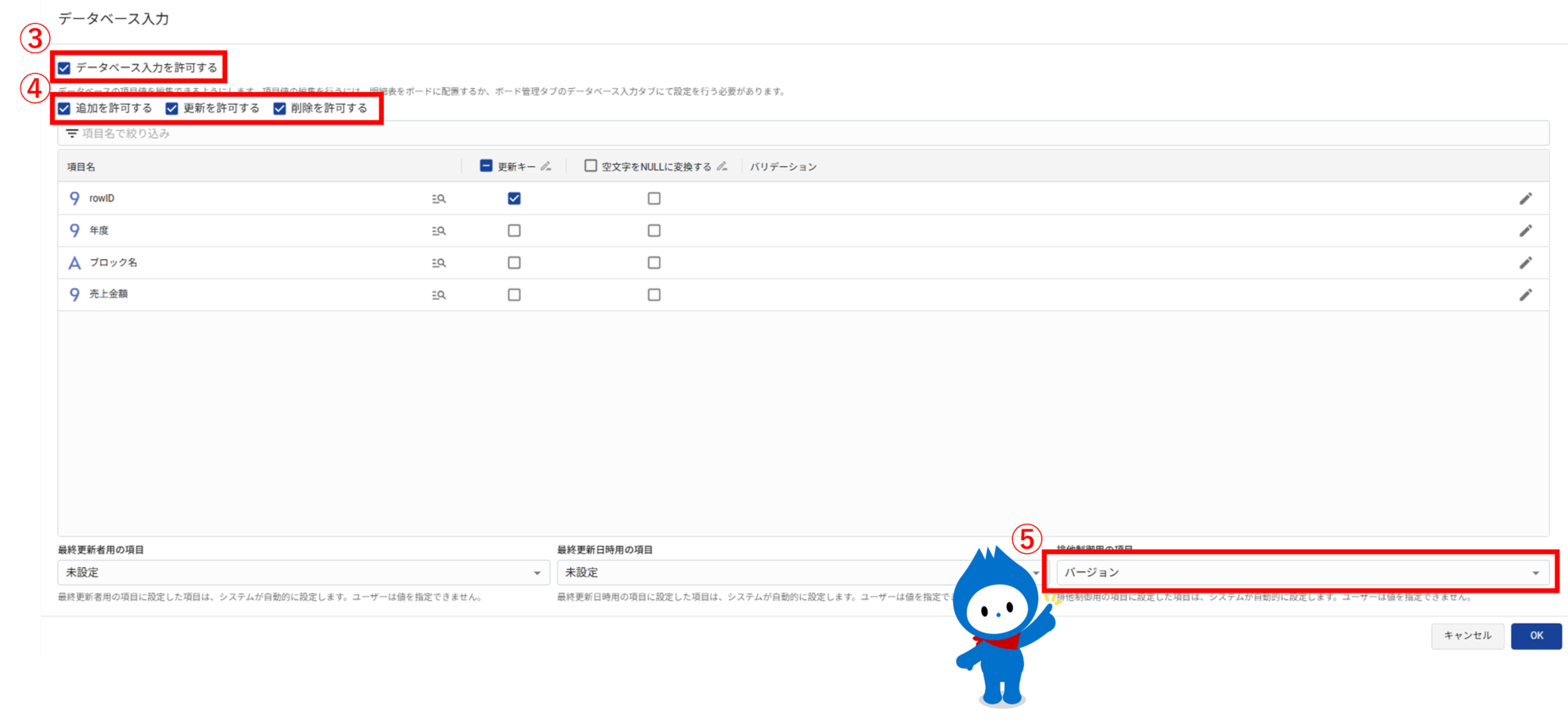 ④ 入力を許可する操作(追加・更新・削除)を選択します。
