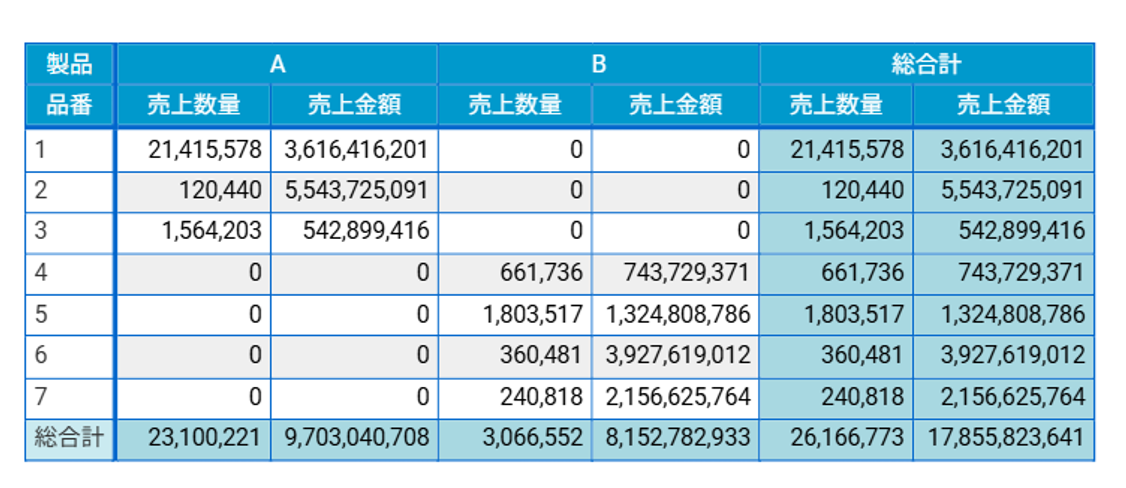 集計表では、列項目に項目を配置すると総合計が自動的に表示されます。