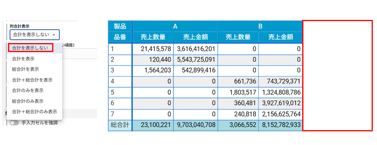 「合計を表示しない」に設定すると、列総合計が非表示になります。
