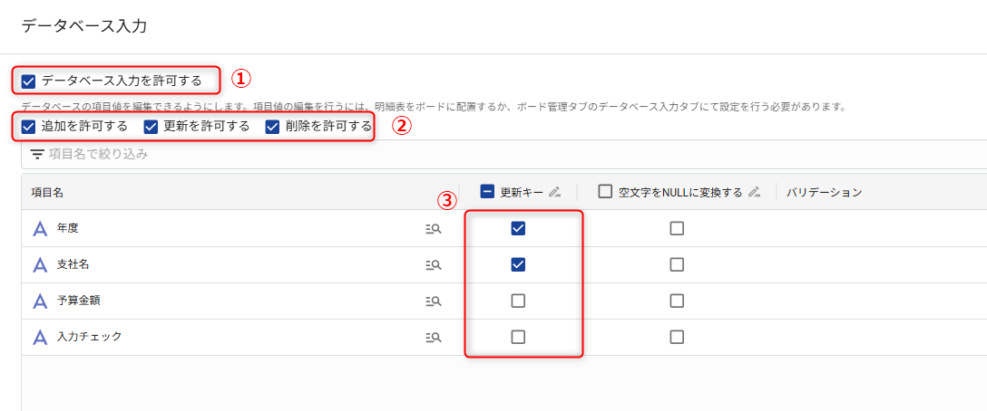 ③項目の一覧にある[更新キー]でデータを更新する際にキーとなる項目にチェックを入れます。