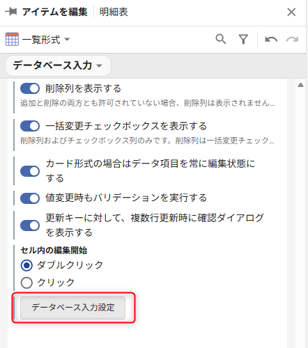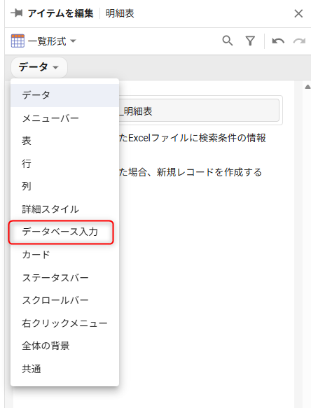 明細表をクリックして表示されるショートカットメニューから[アイテムを編集]クリックし、[データベース入力]の設定項目を開きます。