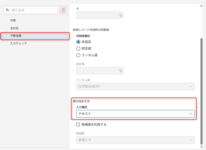 予算金額は値を直接入力させたいので、下の画面のように[入力種別]を[テキスト]に設定します。