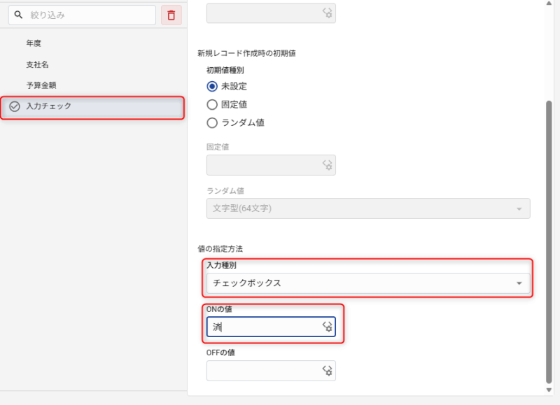 入力チェックは、チェックボックスでチェックを付けられるようにしたいので、[入力種別]を[チェックボックス]に設定します。