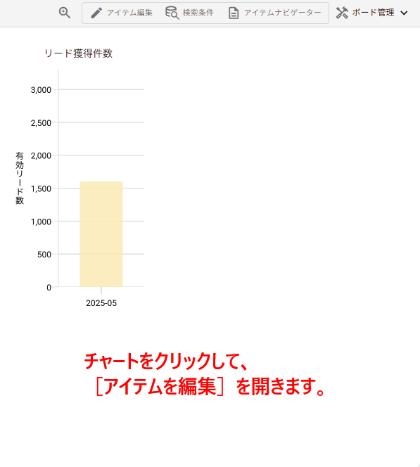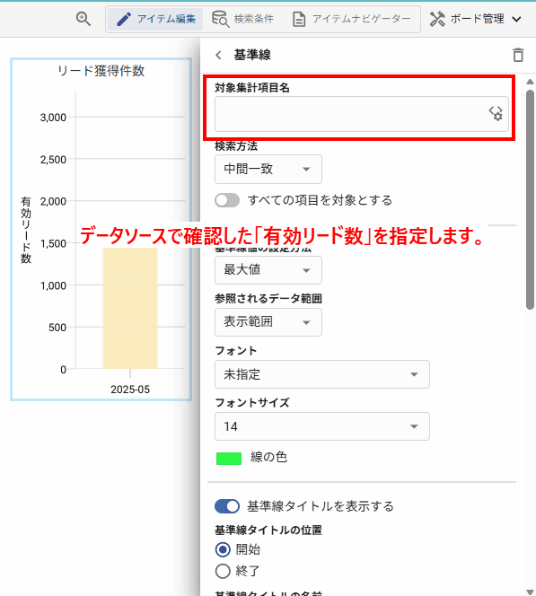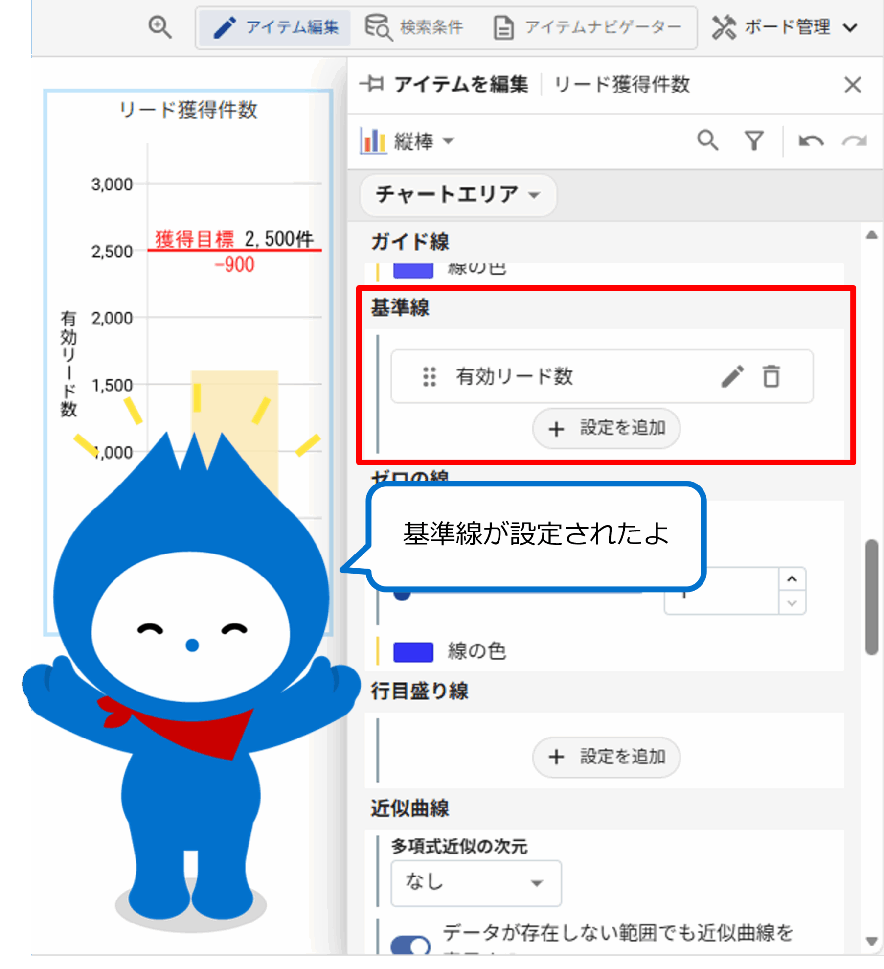 アイテムを編集に戻ると、基準線の項目に「有効リード数」が入り、チャートに反映されています。