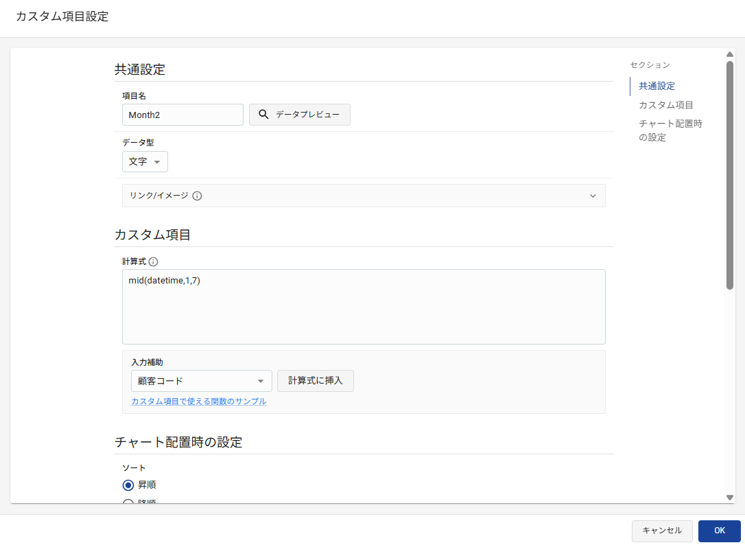 今回のような「yyyy/mm」を表示するだけでよいのであれば、下図のように[カスタム項目]を使用してみましょう。