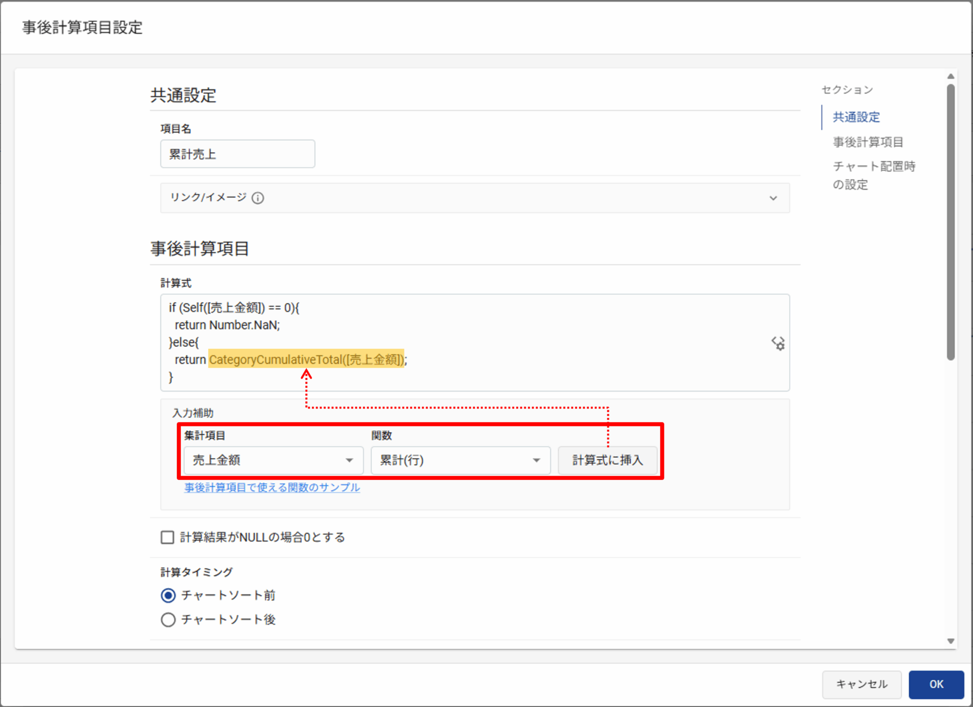 「累計売上」の事後計算項目には、「売上金額」項目の累計を設定します。 このとき、売上金額が存在しない場合は値を表示せず、 売上がある期間のみ累計を表示するように IF 文を設定します。