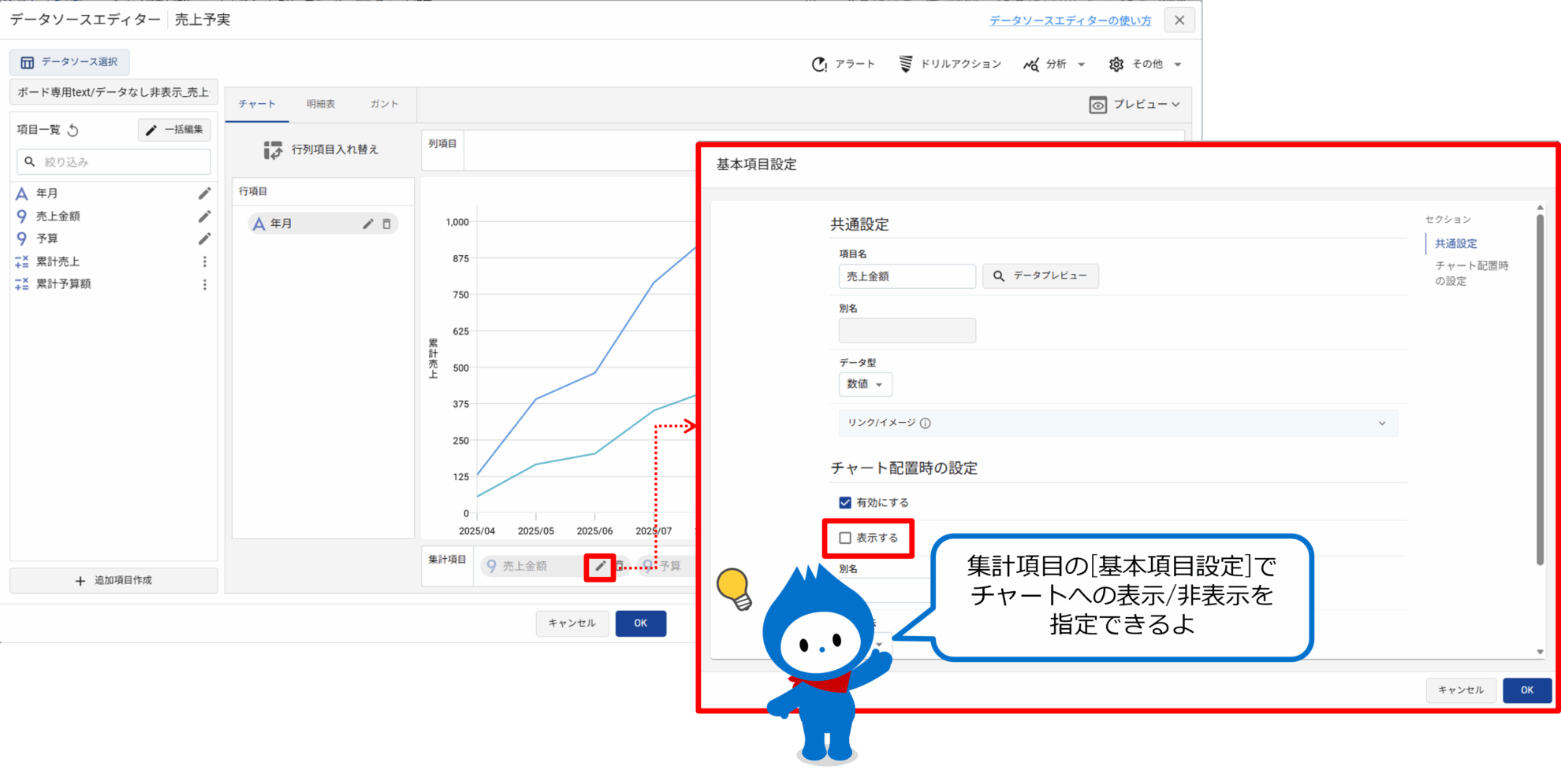「売上金額」 と 「予算」 は非表示にし、 「累計売上」 と 「累計予算額」 のみが表示されるように設定します。