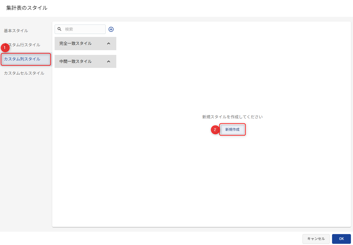 ①[カスタム列スタイル]タブを開き、[新規作成]ボタンををクリックします。