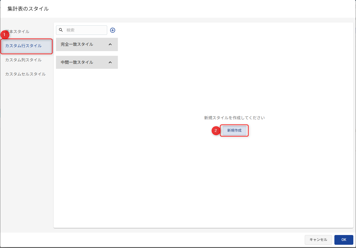①[カスタム行スタイル]タブを開き、[新規作成]ボタンをクリックします。