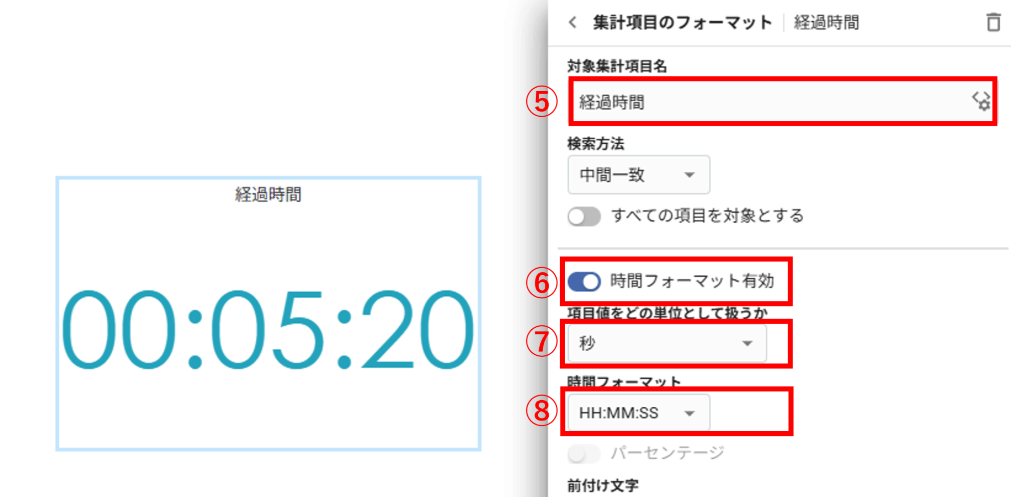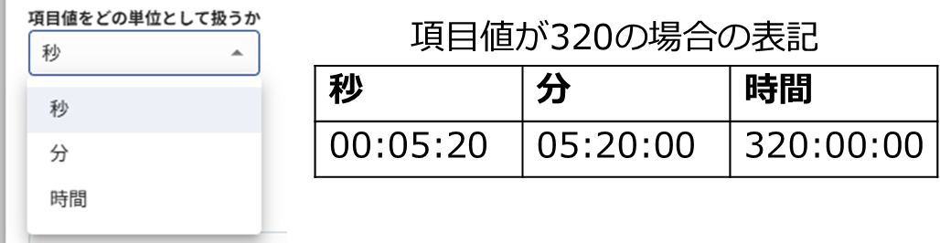例えば項目値が320の場合、「秒」と指定すると320秒として05:20のような時刻表示になります。