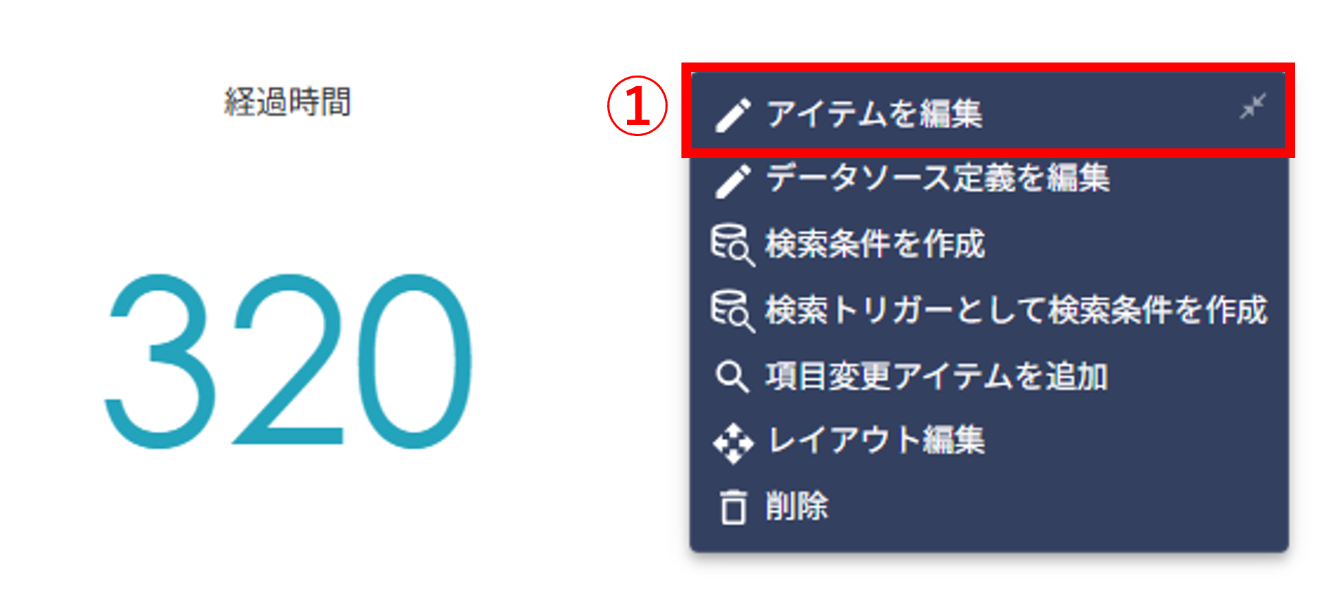 ①[対象のチャート]をクリックし、表示されたメニューから[アイテムを編集]をクリックします。