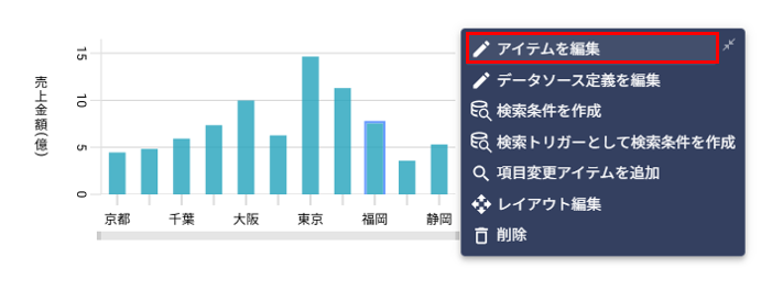 設定したいチャートアイテムをクリックし、表示されたメニューから[アイテムを編集]をクリックします。