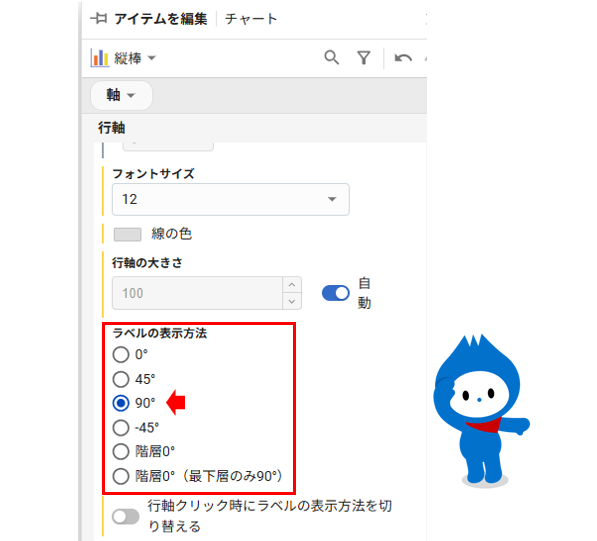 行軸の設定内にあるラベルの表示方法を「90°」に変更します。