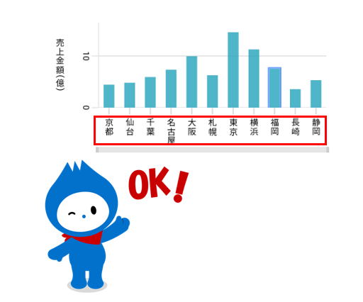 例えば、棒グラフで売り上げを表示させたが一部の地域名が表示されないといった場合など、アイテムの表示エリアが狭いと行軸ラベルが一部非表示になってしまいます。