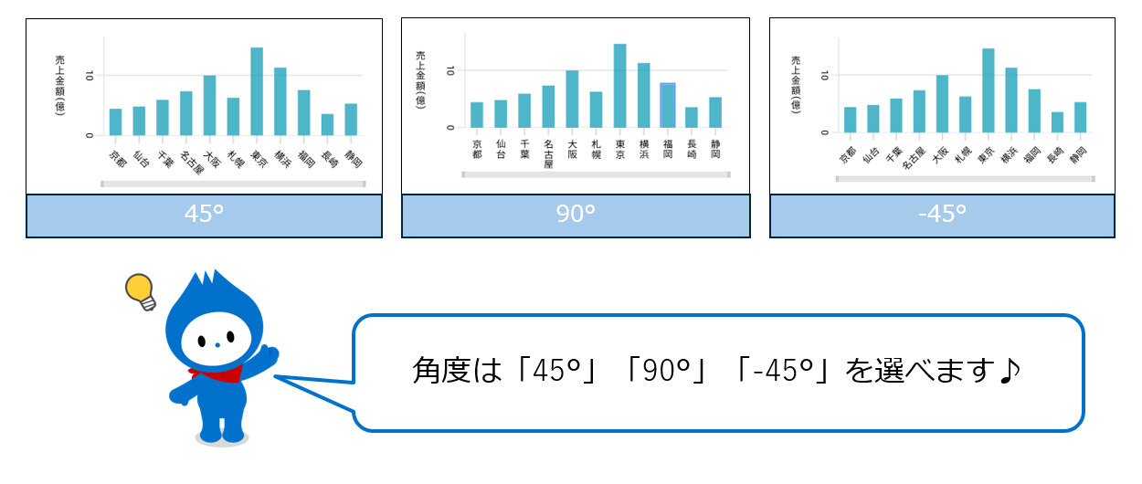 行軸ラベルは、「45°」「90°」「-45°」など様々な向きを設定することができます。