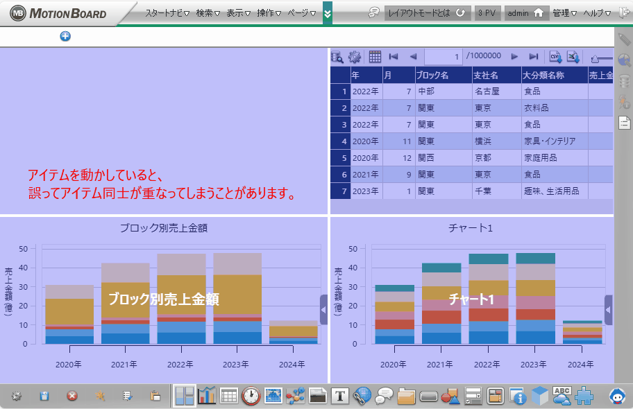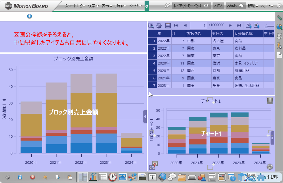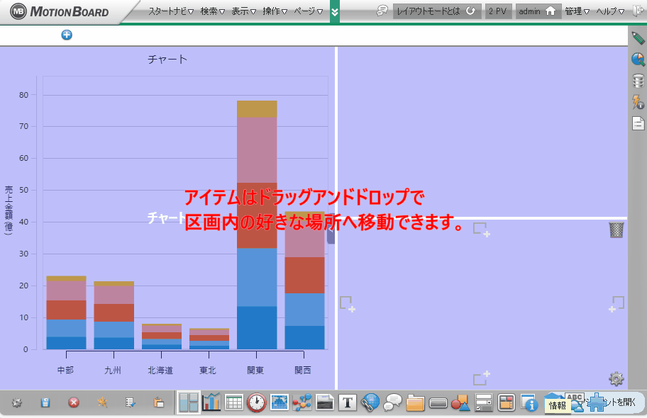アイテムを設置したい場所にマウスカーソルを動かして出現する「+」をクリックすると、その場所に新しい区画が作られます。区画は縦や横に分割できます。たとえば、大きな区画を横に2つに分けて「グラフと表を並べる」といった使い方が可能です。