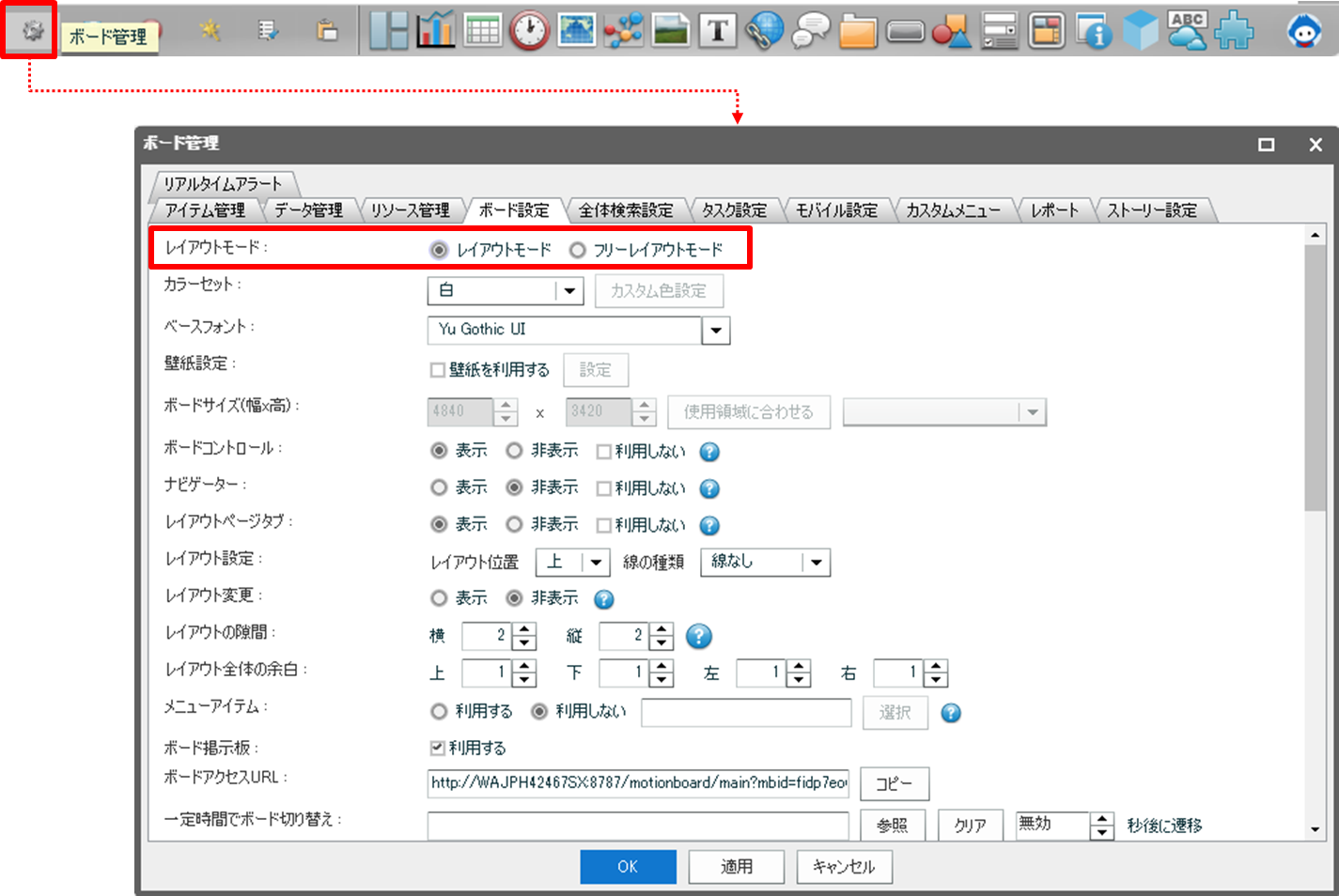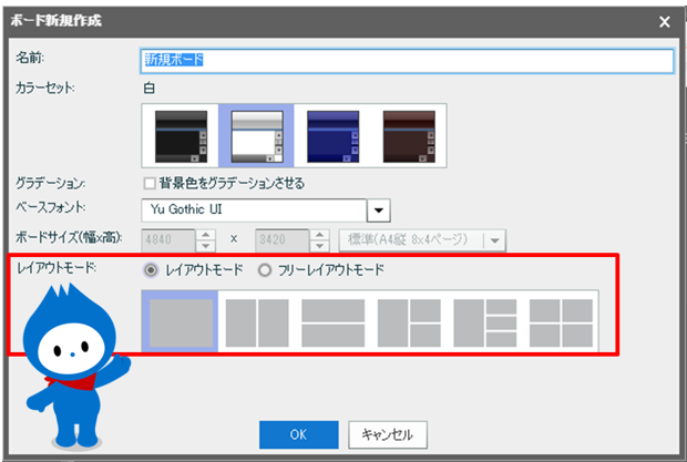 新しくダッシュボードを作成するとき、[レイアウトモード]と[フリーレイアウトモード]の2種類から選択できます。
