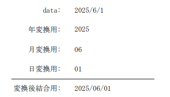 今回は、「2025/6/1」→「2025/06/01」のように、の月と日が一桁のデータを、”0″を付与することで2桁に整える場合の設定方法をご説明いたします。