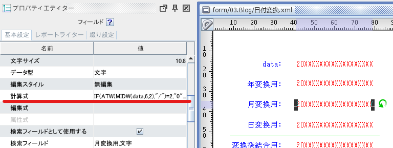 以降の説明では、「data」というフィールド名に「2025/6/1」の文字が入っており、それを変換する前提の説明を行います。