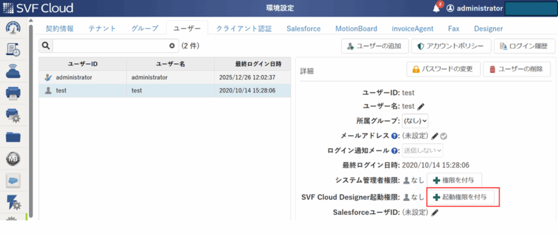 以下の画面で、「SVF Cloud Manager」にログインしたアカウントを見つけ、「起動権限を付与」ボタンを押しますと、そのユーザに対して起動権限が付与されます。
