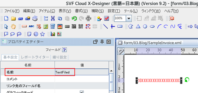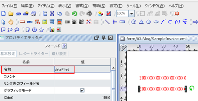 作成した帳票は少量の文字が出るだけのシンプルなものですが、これに明細や罫線などを追加していくことで実際の帳票になります。